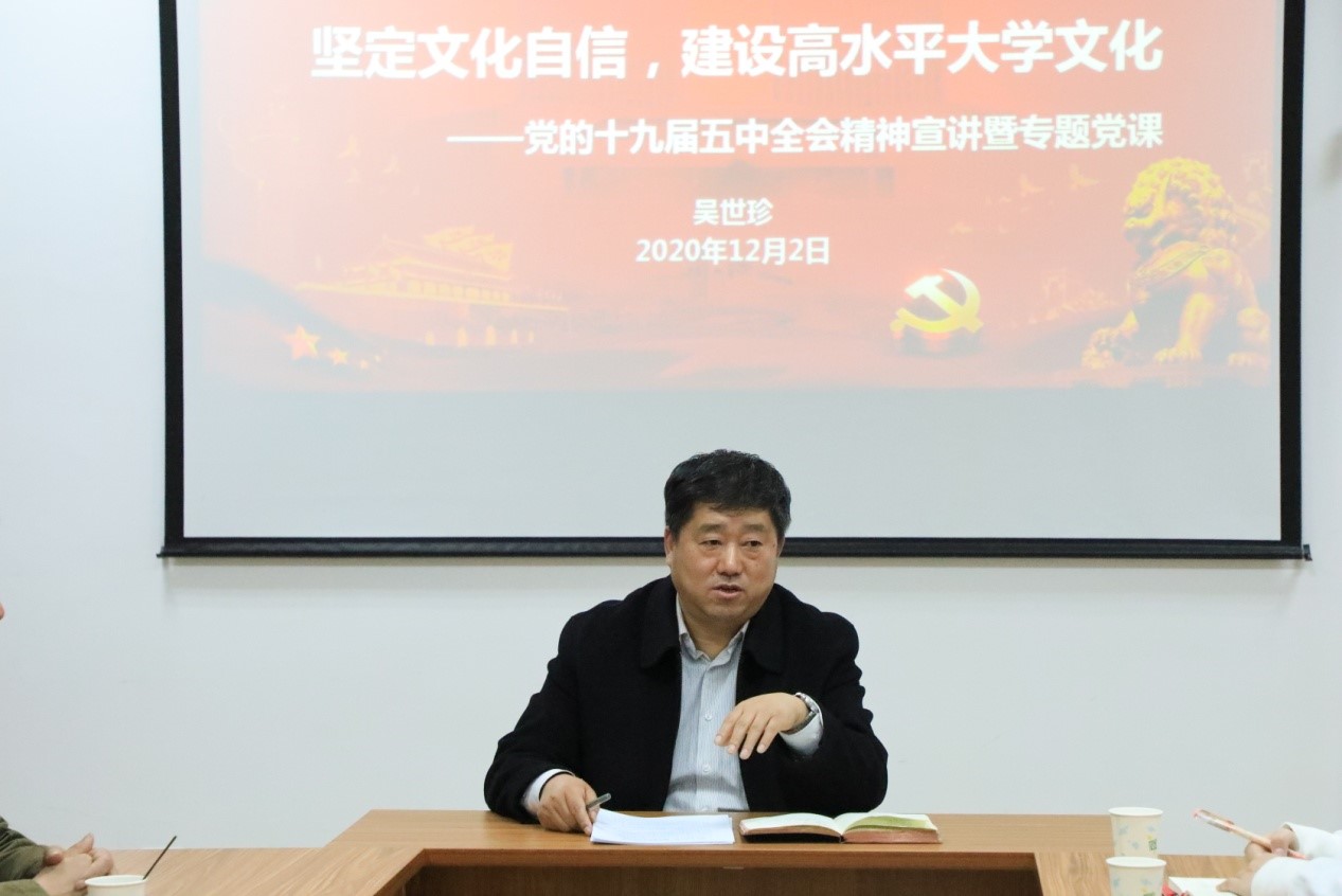 吴世珍以《坚定文化自信,建设高水平大学文化》为题做专题报告,从十三五时期的重大成就、面临的机遇与挑战、以及十四五短期与愿景目标三个方面对十九届五中全会中文化建设进行宣讲。他谈到:党的十九届五中全会着眼战略全局,对 “十四五”时期文化建设作出部署,明确提出到2035年建成文化强国的远景目标,体现党在推进中华民族伟大复兴进程中创造中华文化新辉煌的信心和决心,为在新发展阶段繁荣发展文化事业和文化产业、提高国家文化软实力提供了“时间表”和“路线图”。在这个过程中要将抓住机遇,在高校师生中树立文化自信,建设高水平的大学文化。