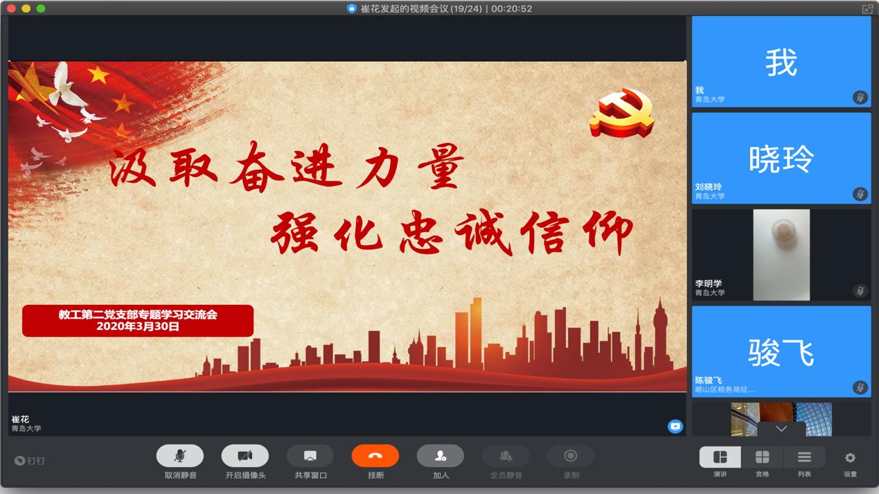 3月20日下午,beat365 官方网站教工第二党支部利用钉钉视频会议召开了“汲取奋进力量,强化忠诚信仰”专题视频学习交流会。会议由教工第二党支部书记崔花主持,beat365 官方网站党委书记王传永及二支部教师党员参加会议。与会党员认真开展了政治理论学习,并结合疫情期间网上授课的经验和体会,对“开展网络思政、强化爱国主义教育、强化对党、对国家的忠诚信仰”等方面内容进行了交流讨论。
