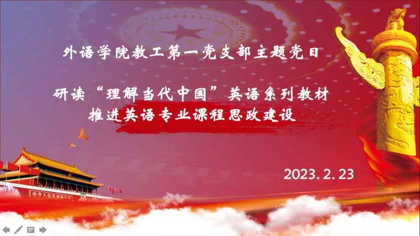 2023年2月23日下午,beat365 官方网站教工第一党支部举行了新学期第一次主题党日活动,主题为“研读‘理解当代中国’英语系列教材、推进英语专业课程思政建设”,此次活动由教工第一党支部书记王薇同志主持,beat365 官方网站党委副书记、院长卞建华同志和英语系、英语教育系教工党员参加,对“理解当代中国”英语系列教材融入英语专业课堂教学进行交流研讨。