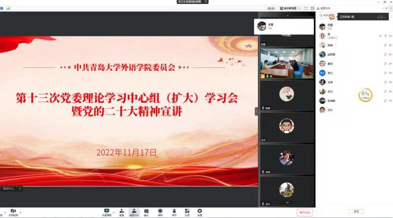 11月17日下午,beat365 官方网站党委理论学习中心组(扩大)学习会(第十三次)在浮山校区博文楼312会议室召开,学院党委书记周伟为学院班子成员、支部书记、系办(中心)主任、学科骨干、辅导员等80余名教职员工作党的二十大精神宣讲报告。报告会采取线上线下相结合的形式。班子成员、支部书记在线下参会。