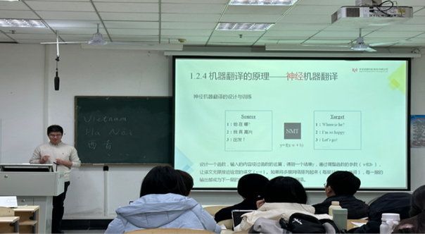 郭昆老师是中译语通科技青岛有限公司语言科技事业部资深翻译,拥有多年服务于大型国际赛会的翻译实践经验,包括上海合作组织青岛峰会、博鳌亚洲论坛全球健康会议和世界旅游城市联合会等。讲座中,郭老师聚焦于机器翻译原理与译后编辑,列举了机器翻译的原理——基于规则、实例、统计的机器翻译,例如使用双语平行语料库、通过“翻译模型”、“语言模型”来翻译等。为了帮助同学们明确神经机器翻译,郭老师现场演示了编码器、解码器的工作思路,深度讲解了译后编辑的过程、要求以及译后编辑人员的培训等。依托多年的从业经验,郭老师还展示了基于CAT的译后编辑过程,以供同学们学习使用。整场讲座干货满满,同学们纷纷表示意犹未尽。