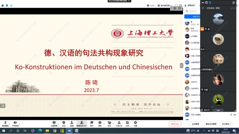 陈琦教授循循善诱,深入浅出地剖析了德、汉语的句法共构现象,令同学们茅塞顿开。讲座结束后,同学们热情高涨,纷纷就句法共构现象的相关问题向陈琦教授踊跃提问,陈教授的解答进一步开拓了同学们的视野,令相聚云端的师生们享受到一场精神盛宴。