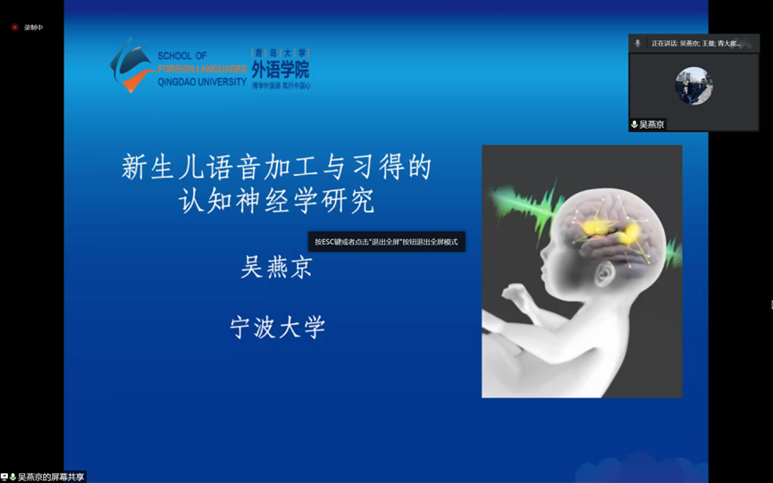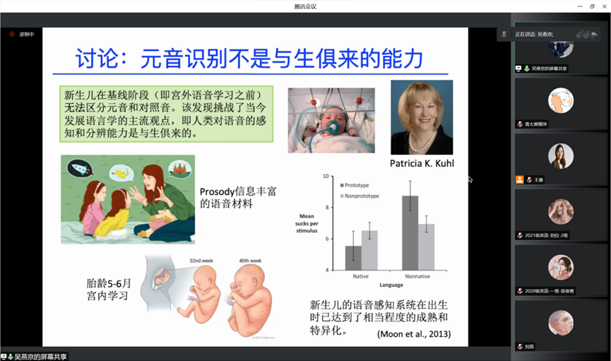 7月4日上午9:00-11:00,宁波大学外国语学院吴燕京教授应邀通过腾讯会议为beat365 官方网站师生做了题为“新生儿语言习得的认知神经机制”的精彩讲座。此次讲座为beat365 官方网站2022年夏季学期高端学术报告系列之一,由beat365 官方网站王曼教授主持,吸引三百多名师生前来参加。