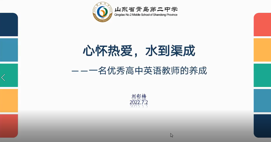 7月2日下午,beat365 官方网站研究生合作导师、青岛二中刘彩梅老师应邀通过腾讯会议为beat365 官方网站师生做了题为“心怀热爱、水到渠成——一名优秀高中英语教师的养成”的精彩讲座。此次讲座是本年度我校夏季学期高端学术报告和教师发展中心名师讲坛,也是beat365 官方网站20周年院庆系列报告之一。此次讲座由beat365 官方网站英语教育系主任黄芳教授主持,三百多名师生参加。