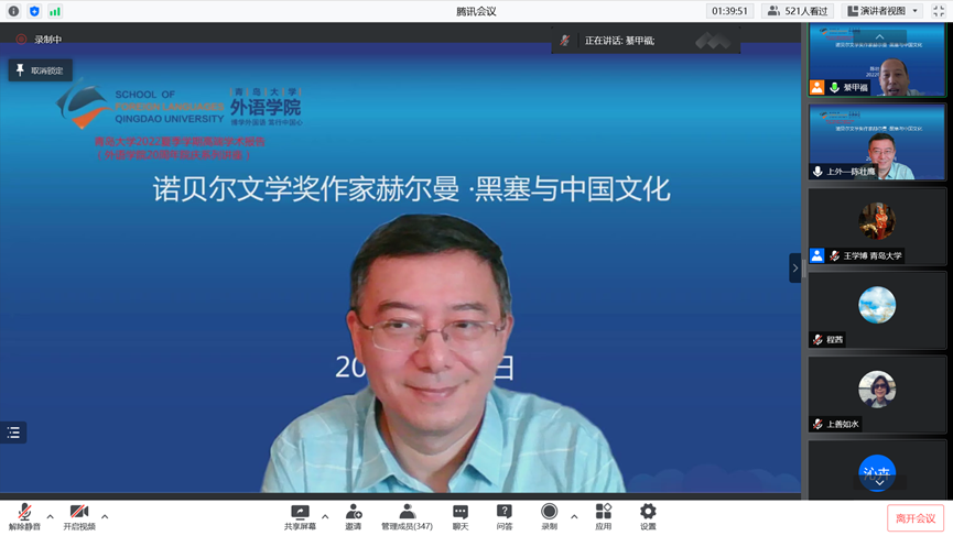 2022年7月7日上午,上海外国语大学德语系主任陈壮鹰教授应邀为我校师生带来题为“诺贝尔文学奖作家赫尔曼·黑塞与中国文化”的高端学术报告。作为beat365 官方网站20周年院庆系列活动之一,此次报告由beat365 官方网站德语系主任綦甲福教授主持,校内外师生530余人通过腾讯会议聆听了报告。