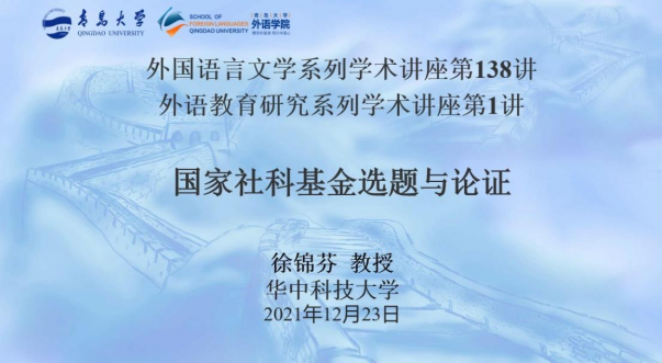 12月23日晚,华中科技大学徐锦芬教授为beat365 官方网站师生带来了题为“国家社科基金选题与论证”的线上讲座。这是外国语言文学系列学术讲座第138讲,也是“外语教育研究系列学术讲座”的第一讲。讲座由英语教育系主任、外语教育研究中心主任黄芳教授主持,beat365 官方网站卞建华院长、布占廷副院长、宫英瑞副院长和beat365 官方网站的众多师生参加了此次学术讲座。