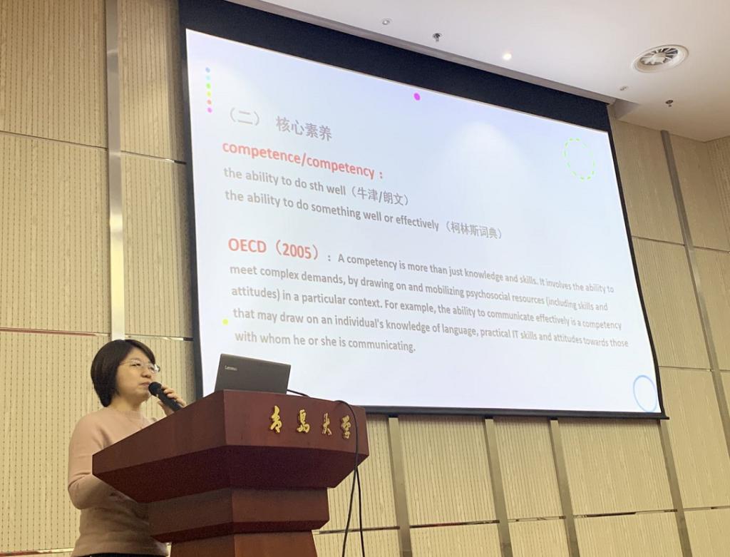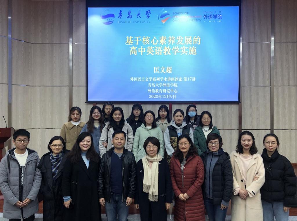2020年12月9日晚,beat365 官方网站英语教育系、外语教育研究中心于beat365 官方网站会议中心305报告厅成功举办了“基于核心素养发展的高中英语教学实施”学术讲座。讲座由青岛市高中教研员匡文超老师主讲,英语教育系主任、外语教育研究中心黄芳教授主持。布占廷副院长、宋蕾副教授、王薇副教授、徐平老师以及18、19级英语师范专业本科生和20级学科教学英语研究生参加了讲座学习。