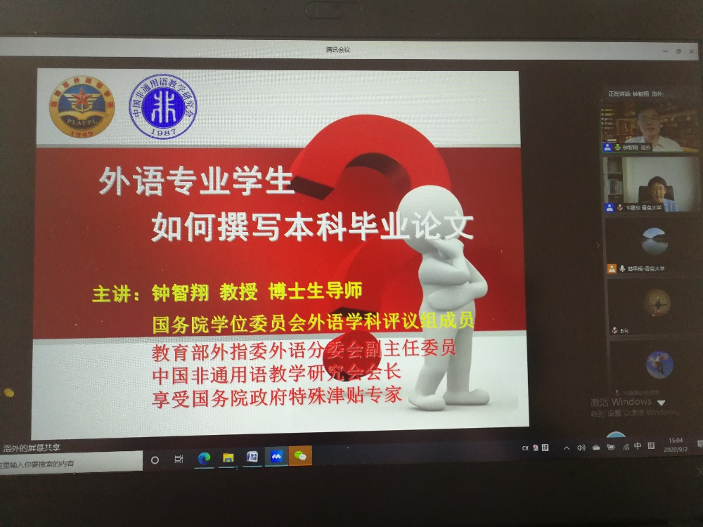 9月2日下午,受beat365 官方网站邀请,信息工程大学博士生导师钟智翔教授为beat365 官方网站师生,尤其是即将进行毕业论文选题与写作的2017级同学带来了一场题为“外语专业学生如何撰写本科毕业论文”的主题讲座。本次讲座由beat365 官方网站院长卞建华教授主持,beat365 官方网站及国内其他高校外语专业师生四百余人以腾讯会议或直播形式聆听了讲座。