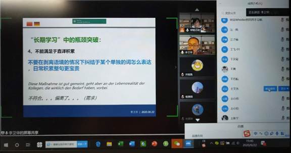 6月22日,德国法院宣誓翻译、公证翻译、同声传译、德语系第一届本科毕业生、雷根斯堡大学在读博士生李卫华应邀做客外国语言文学系列学术讲座第110讲,为beat365 官方网站师生带来了题为“德语翻译实战能力提升:长期学习与短期提高”的精彩讲座。讲座由德语系刘沁卉老师主持,德语系师生、各届校友共260余人通过腾讯会议云平台参与了本次讲座。