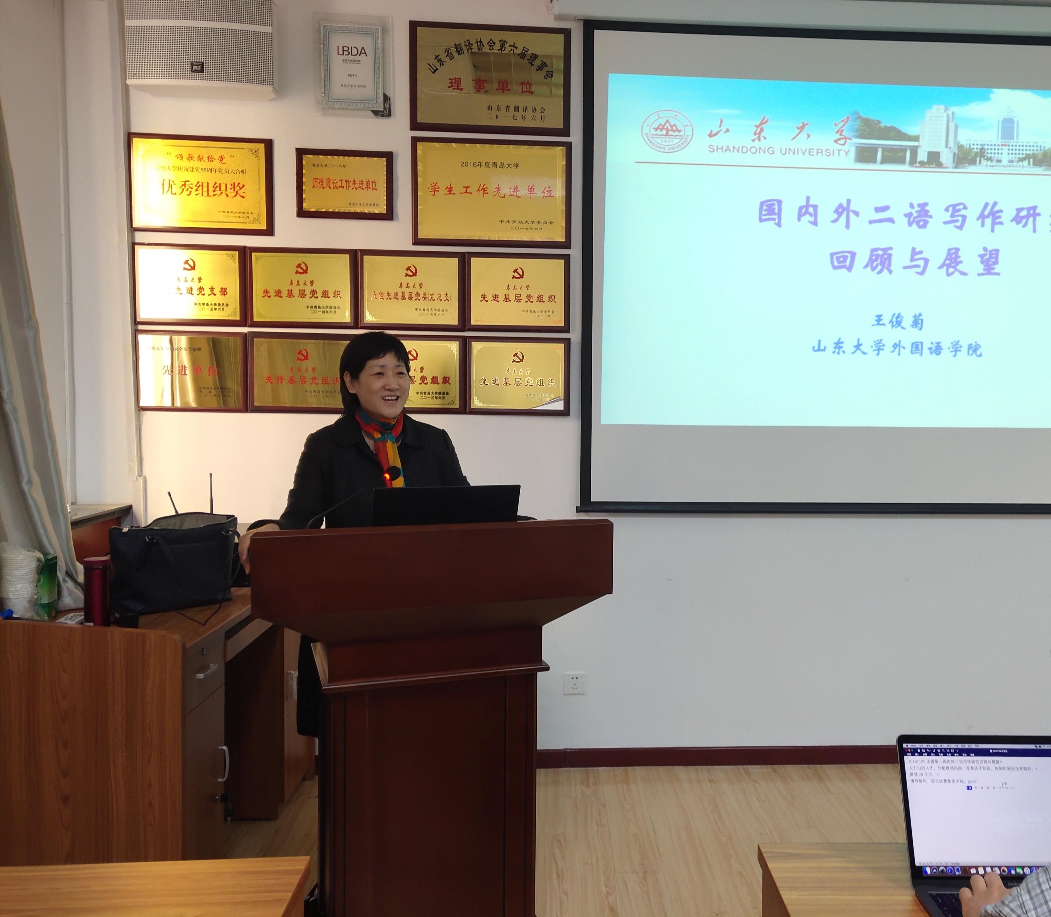 2019年11月8日,山东大学特聘教授王俊菊在博文楼312室为beat365 官方网站师生带来了题为“国内外二语写作研究的回顾与展望”的精彩学术讲座。此次讲座由beat365 官方网站院长卞建华主持,beat365 官方网站副院长布占廷以及孙旻、王曼等老师和beat365 官方网站部分学生出席了讲座。