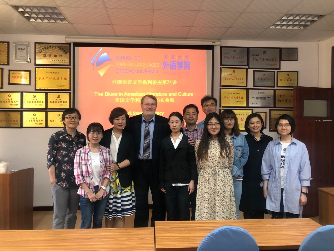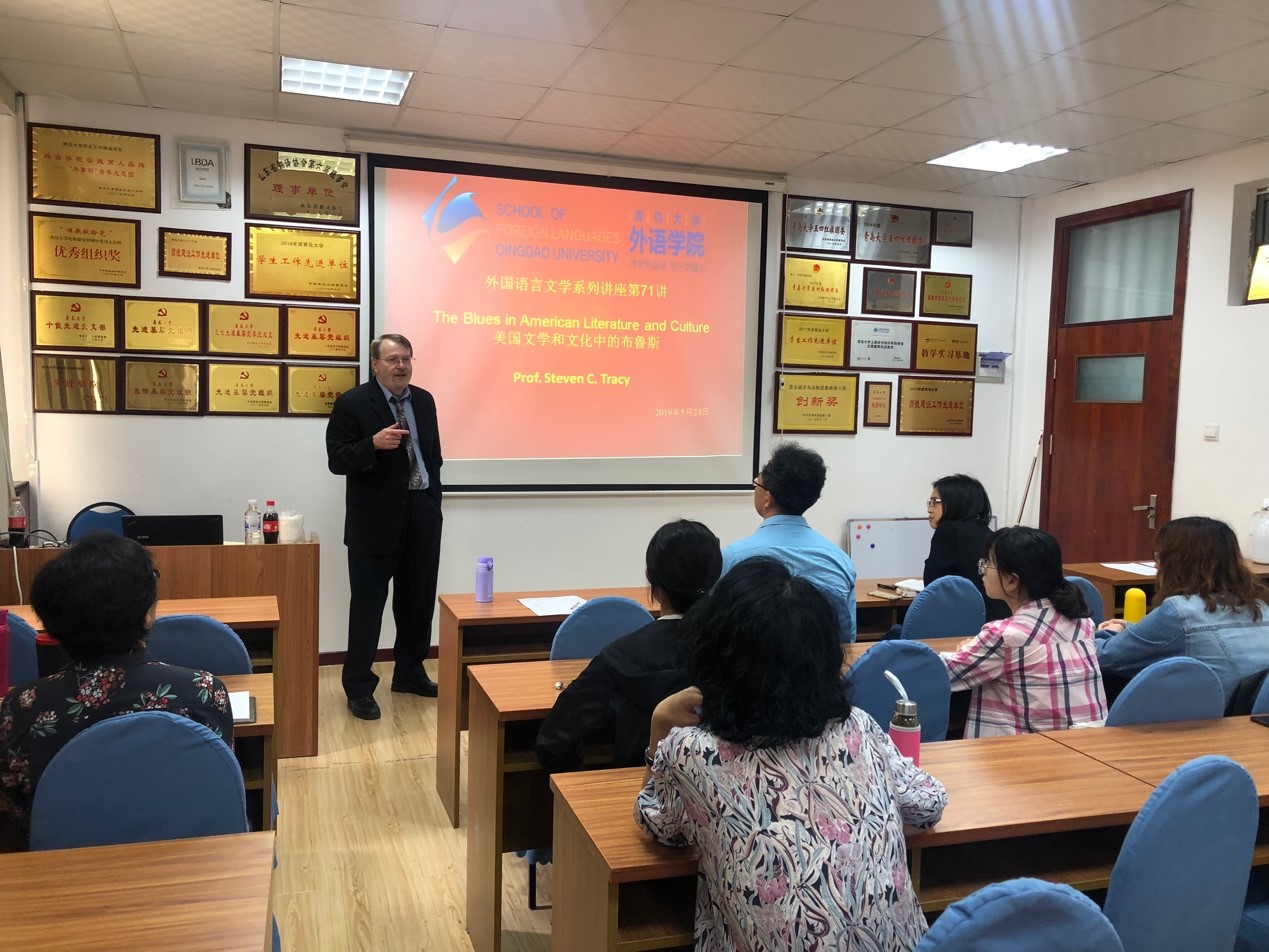 2019年5月24日上午,马萨诸塞大学阿默斯特分校杰出教授、非裔美国文学研究学者、音乐表演家史蒂文•特雷西(Steven C. Tracy)应邀到beat365 官方网站,带来了一场题为“美国文学和文化中的布鲁斯”的讲座。讲座由英语系王薇老师主持,beat365 官方网站、公共外语教育学院多名师生聆听了特雷西教授别开生面的讲座。