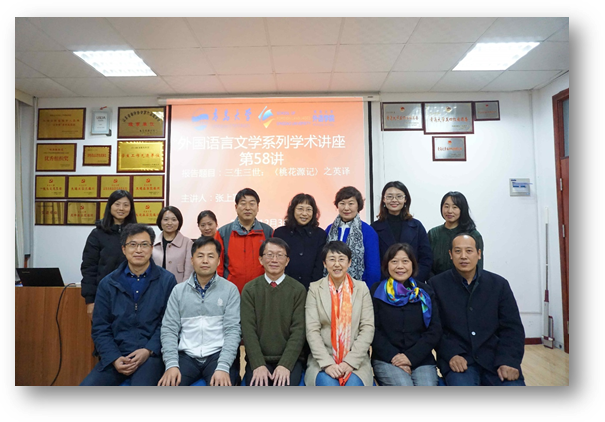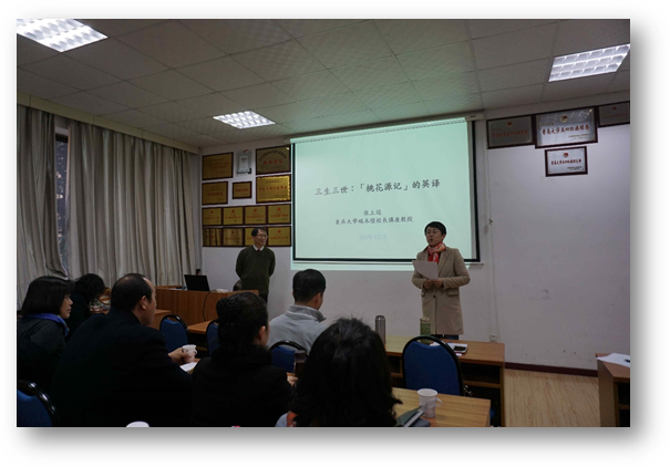 12月3日下午,beat365 官方网站在博文楼312会议室举行“外国语言文学系列学术讲座”第58讲。翻译理论及文化研究著名台湾学者张上冠教授应邀作“三生三世:《桃花源记》之英译”的专题学术讲座。院长卞建华主持讲座,学院部分老师及研究生参加此次讲座。