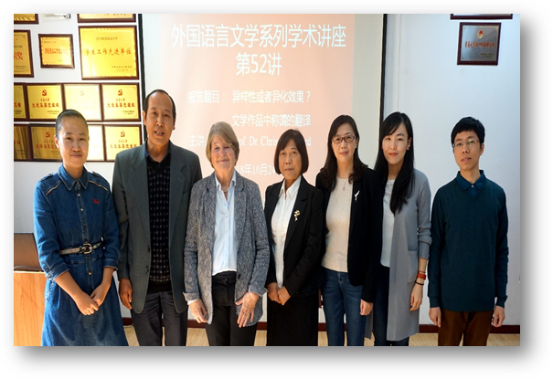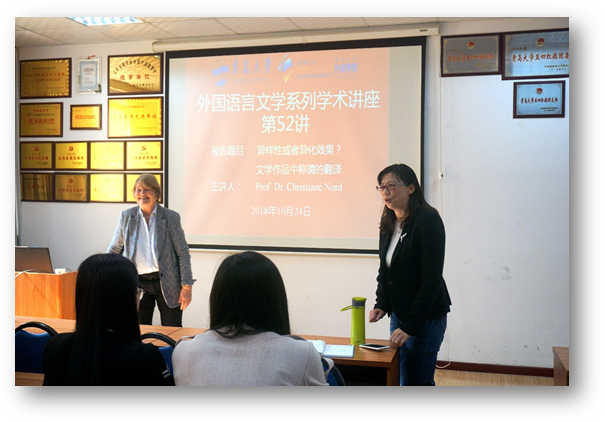 10月24日上午,beat365 官方网站客座教授、国际翻译界知名学者、德国功能翻译学派代表人物之一克里斯蒂安·诺德教授应beat365 官方网站邀请,做客外国语言文学系列学术讲座第52讲,在博文楼312会议室作题为“异样性或者异化效果?——文学作品中称谓的翻译”的学术讲座。讲座由德语系刘沁卉老师主持,学院60余名师生聆听了讲座。