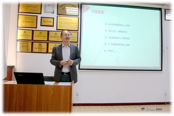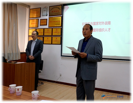 10月12日下午,北京外国语大学贾文键教授应beat365 官方网站邀请,做客外国语言文学系列学术讲座第51讲,在博文楼312会议室作题为“积极配合国家对外战略,大力培养国际组织人才”的学术讲座。讲座由德语系系主任綦甲福教授主持,学院60余名师生聆听了讲座。