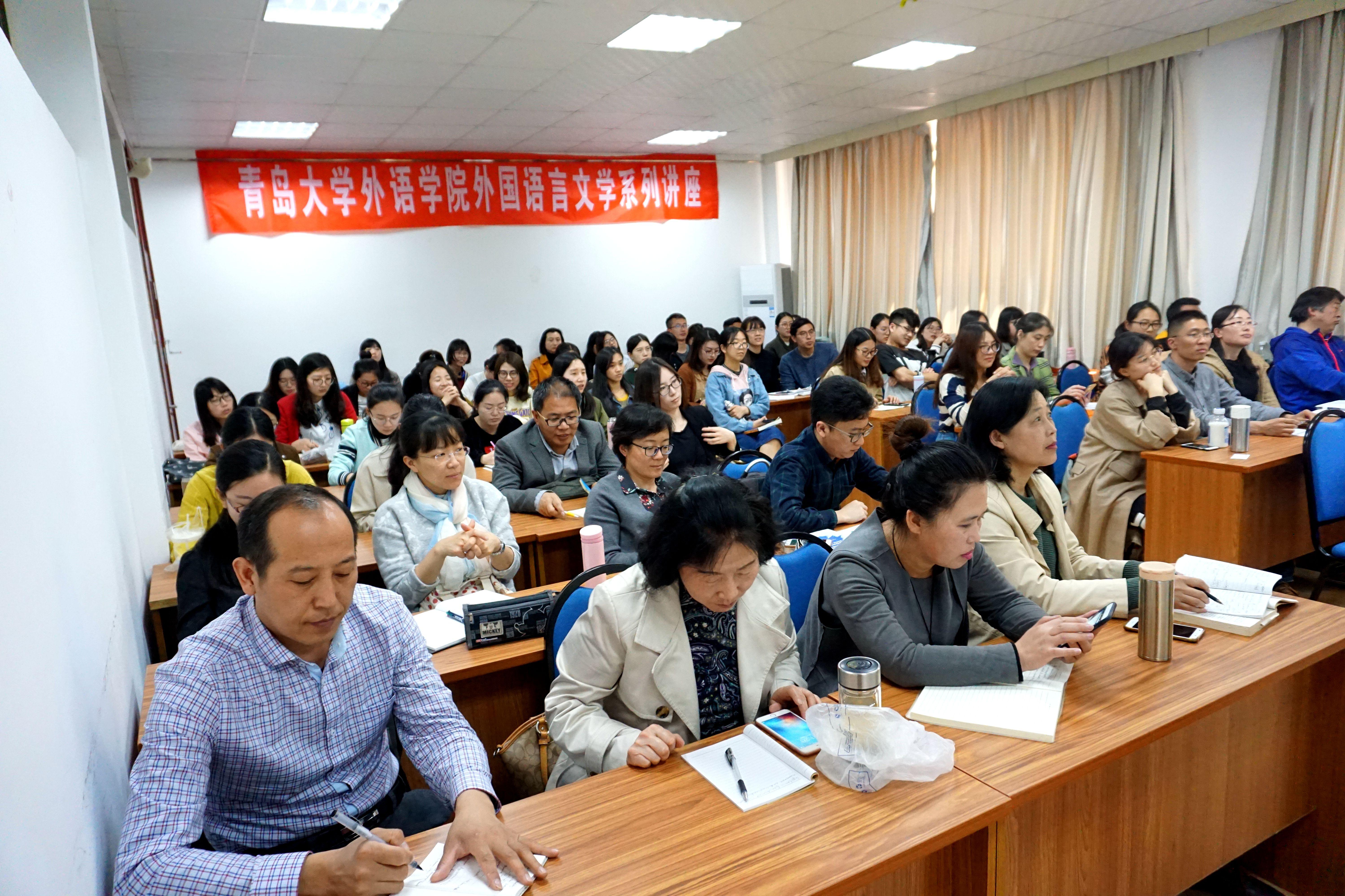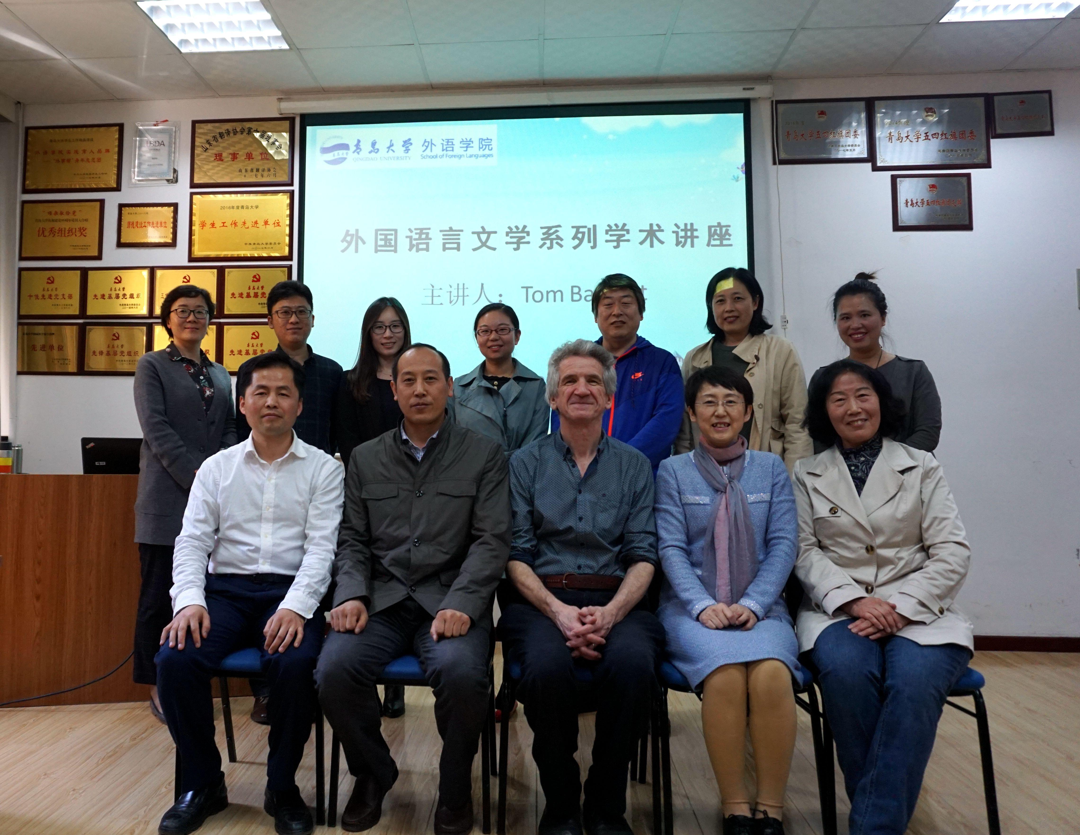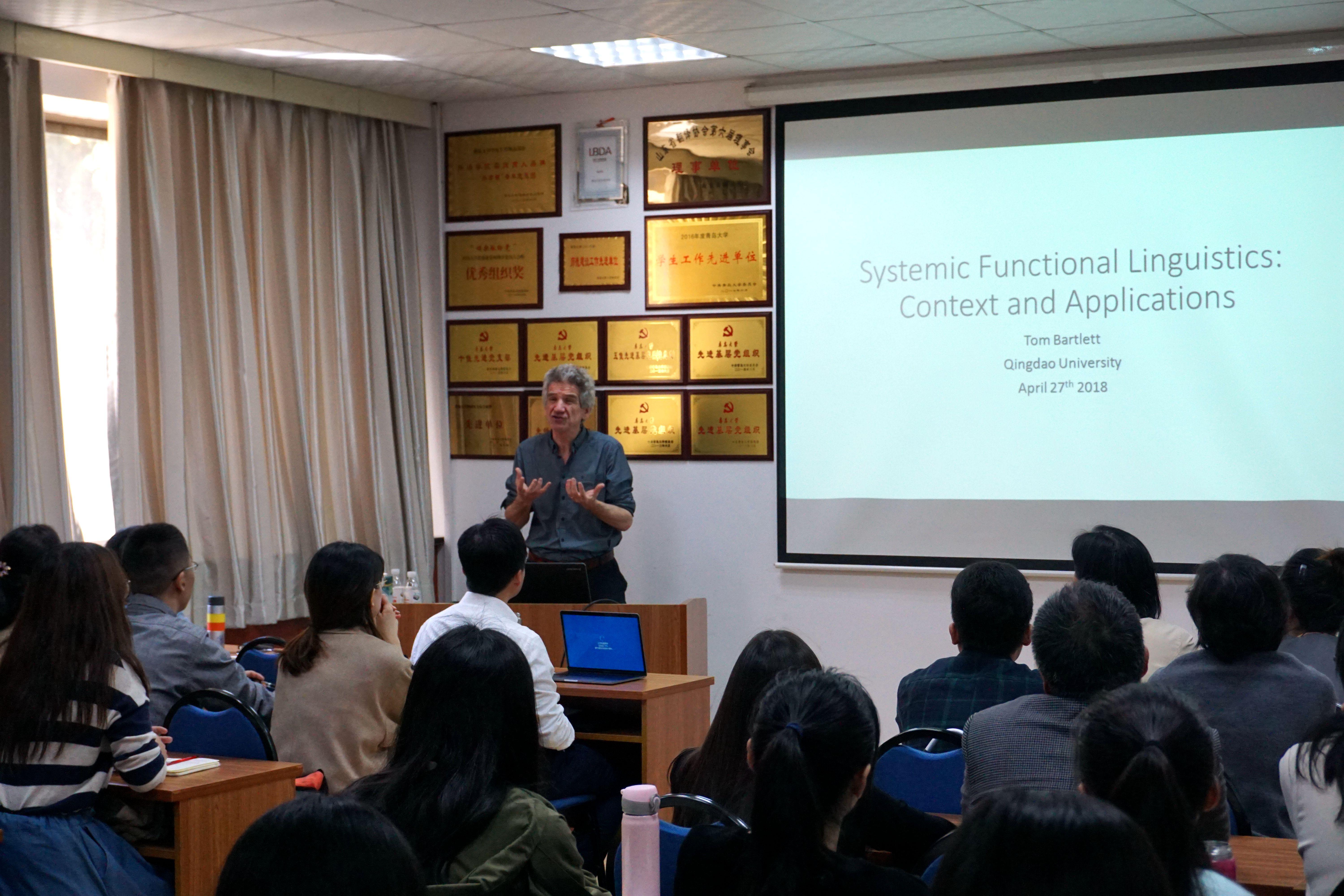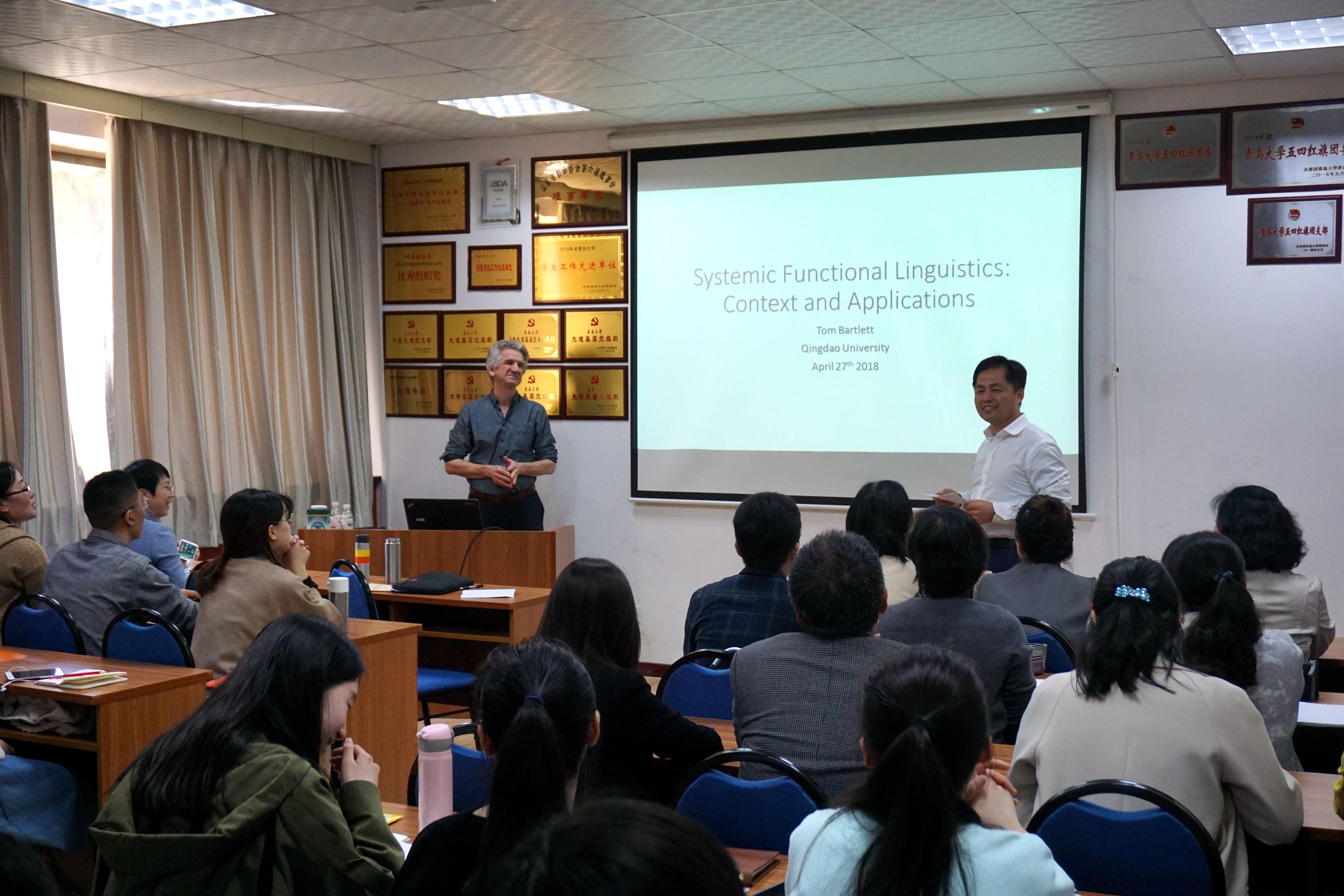 4月27日上午,beat365 官方网站在博文楼312会议室举行外国语言文学系列学术讲座第38讲。英国卡迪夫大学Tom Bartlett博士应邀作“系统功能语言学:语境与应用”专题学术讲座。院长助理布占廷主持。院长卞建华、学院部分教师和研究生,以及来自中国海洋大学、青岛科技大学和我校公共外语教育学院的十余位教师聆听了讲座。