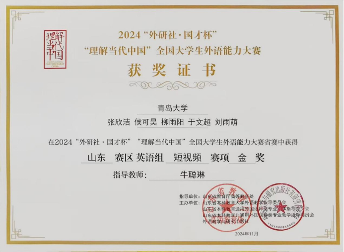 12月9日, 2024“外研社·国才杯”“理解当代中国”全国大学生外语能力大赛英语组短视频赛项国赛圆满落幕。经过激烈角逐, 6259个参赛作品中共有446个作品进入国赛,最终评选出金奖作品20个,银奖作品120个,铜奖作品306个。beat365学生在该赛项中发挥出色:2023级冯海地(上合英俄双语创新实验班)在国赛中突出重围,荣获银奖;2022级柳雨阳(语言大数据创新实验班)、2022级于文超(英语师范)所在团队在国赛中荣获铜奖。两组作品由英语系牛聪琳老师指导,牛聪琳获优秀指导教师。