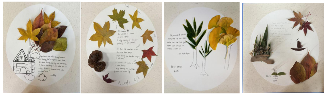 随后,学科教学(英语)的研究生们在挑选落叶、创画赋诗的过程中亲身体验“叶子画语”,创作出丰富多彩的作品。这些作品有的描绘美丽的校园建筑,有的融合先进的教育理念和人生感悟,有的呈现电影和文学名著,有的深情赞美人与自然的和谐美好。宋蕾老师对此给予了高度评价,她认为“叶子画语”项目在愉悦的互动体验中,激发灵感、净化心灵、激活内驱、提升素养,并鼓励同学们在生活中、自然中发现美,在教与学的路上心中有爱、眼中有光。