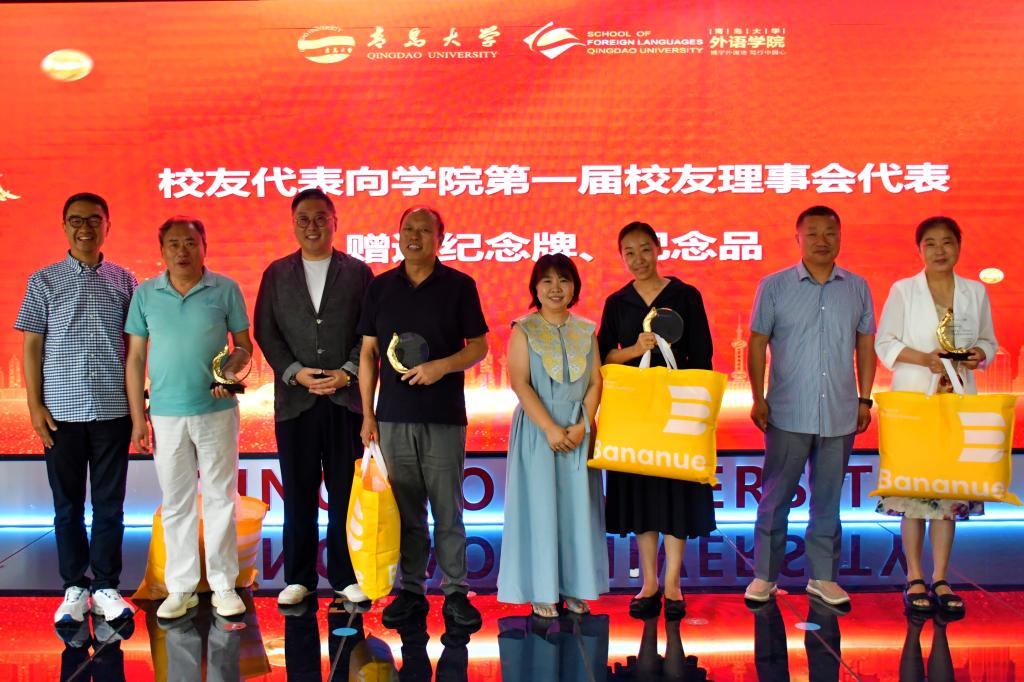 校友代表向第一届校友理事会成员代表赠送纪念牌纪念品、校友代表向外语学院老领导、老教授赠送鲜花、纪念品,致敬他们为外语学院校友工作发展做出突出贡献