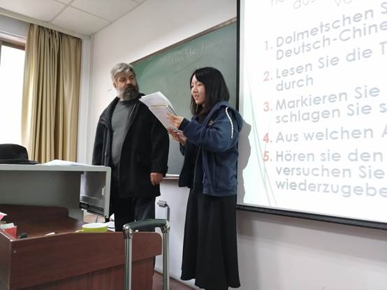 课程的最后一个环节,由李克教授与一位同学共同模拟交传口译情景,看到刚刚学习了两年德语和半个学期口译的本科三年级同学也能流畅地完成一篇德语致辞的交替传译,在座同学都感到备受鼓舞,李克教授也对同学们的表现予以积极的肯定。通过此次培训,同学们进一步加深了对口译活动的理解,同时提升了口译学习的积极性和学好口译的信心。