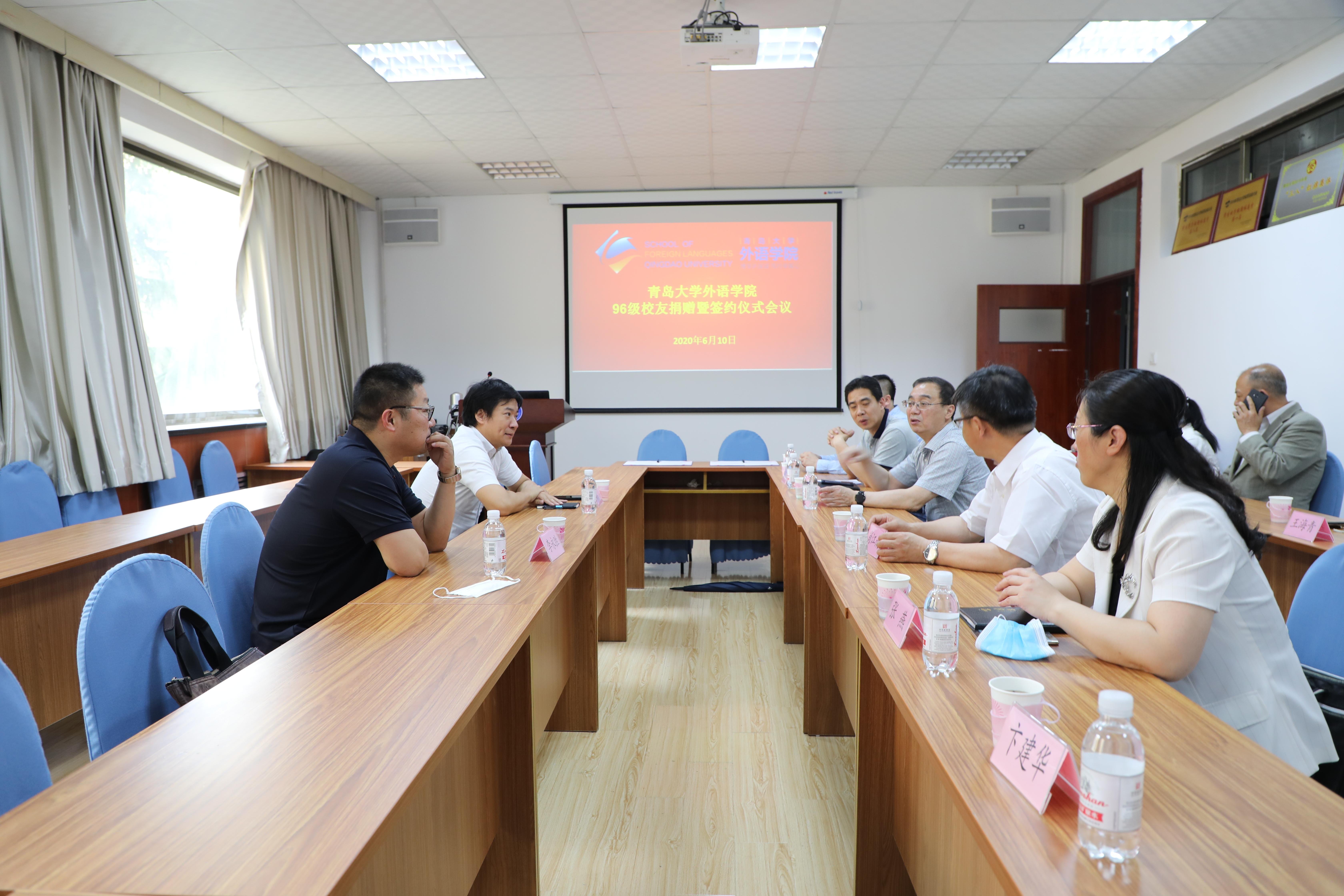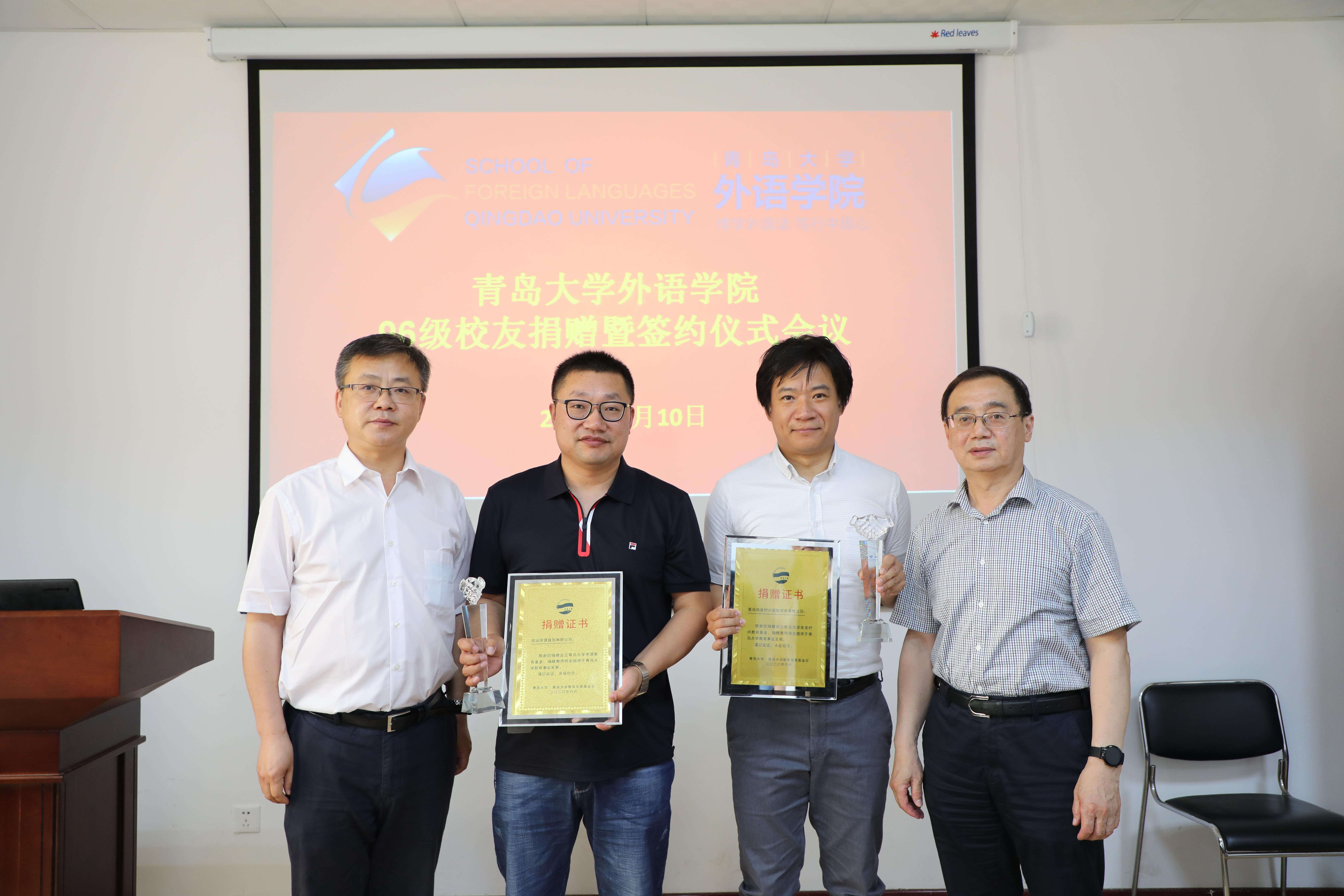 6月10日上午,在学校日语本科专业招生35年之际,beat365 官方网站96级日语专业校友、青岛依美时尚国际贸易有限公司董事长刘伟、beat365 官方网站96级日语专业校友、招远帝源服饰有限公司总经理李永胜向母校捐赠设立教育基金签约仪式在博文楼312会议室举行。校党委常委、副校长肖江南、校领导邵彬、校合作发展处、校友工作办公室、beat365 官方网站主要负责人及教师代表参加了仪式。仪式由beat365 官方网站党委书记王传永主持。