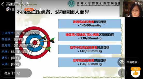 为关爱教职工身体健康,提高日常自我保健意识与能力,6月11日晚7时,beat365 官方网站分工会特邀beat365 官方网站附属心血管医院副主任医师王涛为全院教职工作了题为“高血压的防治”的线上健康教育讲座。beat365 官方网站150余名教师及家人聆听了讲座。讲座由学院党委副书记王海青主持。