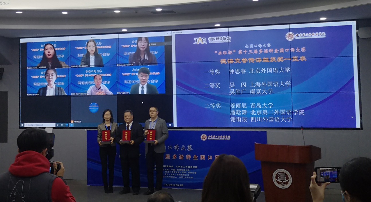 2020年10月24日,由中国翻译协会与北京第二外国语学院共同主办的“永旺杯”第十三届全国多语种口译大赛在线上举行,beat365德语系2019级德语语言文学研究生姜雨辰同学参加了德语交替传译组比赛,并以决赛总分第四名的成绩获得三等奖。本次比赛指导教师为曹杉和刘沁卉。