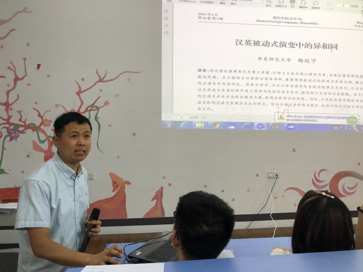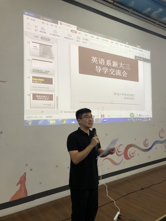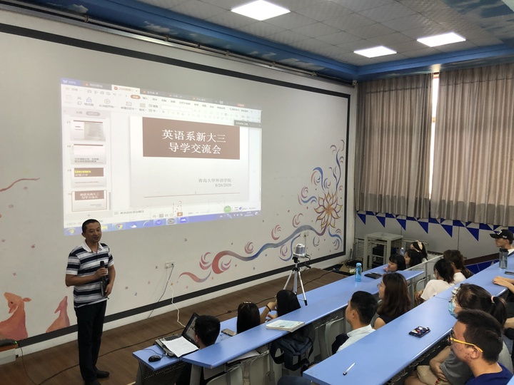 2020年8月26日下午,beat365 官方网站英语系新大三导学交流会在博文楼218阶梯教室成功举行。交流会上,英语系主任邢富坤、副主任王薇、李忠善、石灿四位老师以及四年级孙铭辰同学,为即将升入三年级的2018级同学们带来了一场承前启后、引发思考的新大三导学讲座。交流会由王薇老师主持,2019级同学通过网络直播同步收看,交流内容涉及语言学、翻译学、文学三个方面,深入浅出,环环相扣,受到师生们的一致好评。