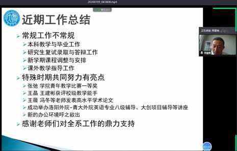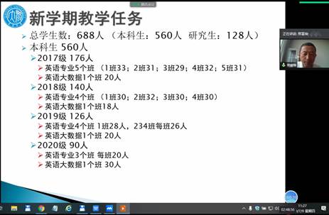 7月9日上午,beat365 官方网站英语系举行在线会议,总结全系学期工作,布置新学期教学任务,会议由邢富坤主任主持,全系教师参加。