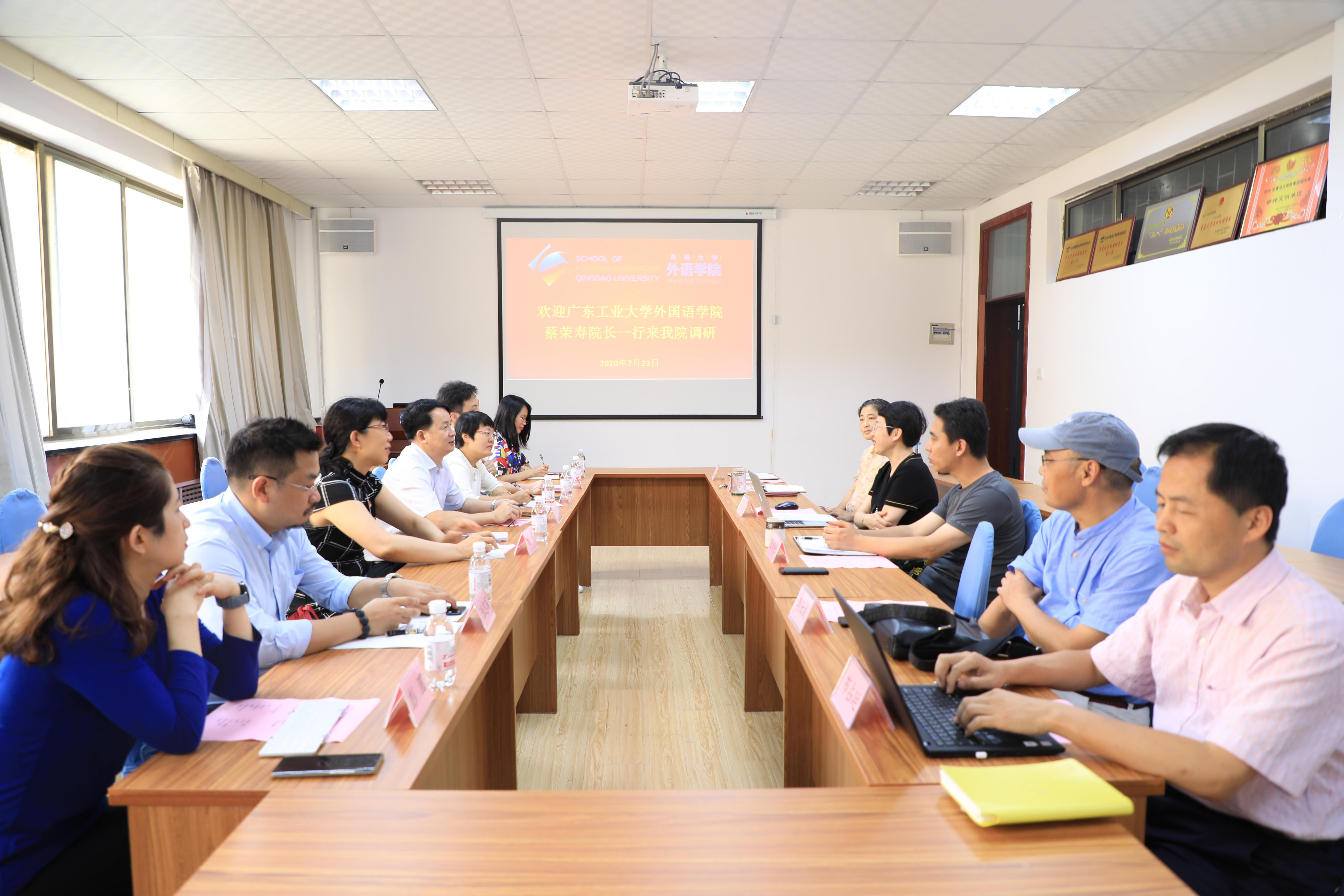 7月23日下午,广东工业大学外国语学院院长蔡荣寿、院党委书记刘伟一行7人来beat365调研交流。院长卞建华、院党委书记王传永、党委副书记王海青、副院长布占廷、英语教育系李汝成教授、党政办主任华登峰在博文楼312会议室与到访客人进行座谈交流。