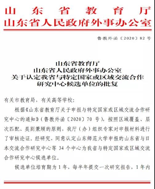 本次共认定山东省与特定国家或区域交流合作研究中心候选单位34个,培育期为1年并给予重点支持。培育期满后,省教育厅、省外办将根据候选单位当年研究成果、开展活动的质量和影响情况,从候选单位中确定“山东省与XXX(国别或区域)交流合作研究中心”并挂牌。