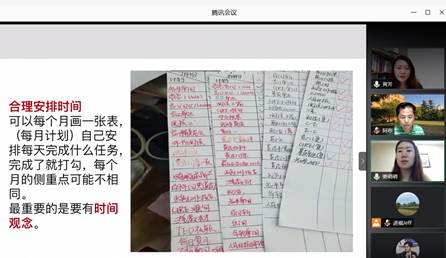 2018级学科教学英语毕业生丁梦分享了读研期间的学习体会;即将入读我校学科教学英语专业的优秀校友孙钰友情提醒2017级同学需要在教学实习、考研和师范生技能大赛三项任务中进行有效的时间管理;2019级学科教学英语硕士生陆洋分享了工作后考研的艰辛历程,并表达了对同学们考研成功的美好祝愿;我校英语语言文学硕士专业的优秀校友郭嘉怡用“严格”、“忙碌”、“提升”三个词总结了研究生备考及学习经历;我校外应专业硕士生吴亚静总结了研究生阶段是个人综合能力提升的过程;就读于山东大学翻译硕士专业的姜萌萌同学分享了当年考研时的时间计划表;将要去兰州交通大学攻读翻译硕士的陈绍梅同学分享了研究生调剂经验,并告诫同学们要准备好应有的证书等;就读于香港理工大学英语教学专业的2015级优秀校友李润兴和就读于北外新传专业的逄杰分别提醒学弟学妹们考研要尽早准备,并注意批判性思维的培养和多学科理论的融会贯通。