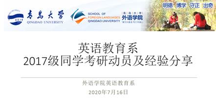7月16日晚,beat365 官方网站英语教育系通过腾讯会议平台举办了考研动员与经验分享交流会,会议由英语教育系主任黄芳、副主任王进福主持,beat365 官方网站娄永强副院长、布占廷副院长莅临会议到场指导,相关老师以及17级英语教育系全体同学参加了本次会议。