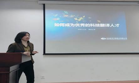 赵忠会老师结合自身工作经验,围绕科技翻译的特点、优秀科技翻译人才应具备的素质、如何成为优秀的科技翻译人才、优秀科技翻译人才的职业发展四个方面进行了精彩的讲解。赵老师指出:首先,扎实的语言功底是外语专业学生必备的基础。其次,大量口笔译实践对MTI专业的学生来说至关重要。另外,要成为优秀的科技翻译人才,不仅要具备扎实的语言功底、丰富的专业知识、较强的责任心,还要具备临场应变能力、耐力、感染力。最后,在互动环节,赵老师就同学们提出的问题进行了详细解答。