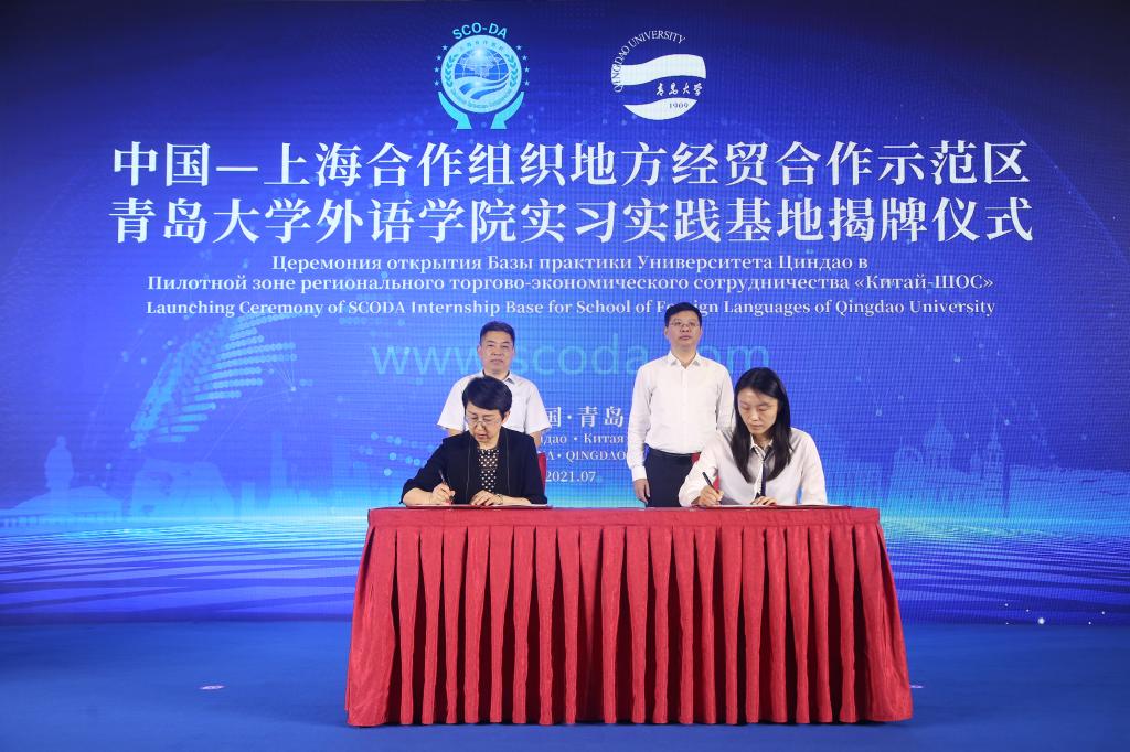 仪式上,校党委副书记杜方波、上合示范区党工委委员、管委会副主任孟庆胜、beat365 官方网站党委书记王传永、胶州市委宣传部副部长赵法文、胶州融媒体中心副主任任献文共同启动上合示范区五语种官方网站上线(试运行),beat365 官方网站院长卞建华与上合示范区管委商旅文化部部长夏鹏共同签署了共建实习实践基地协议,杜方波与孟庆胜共同为beat365 官方网站实习实践基地揭牌。