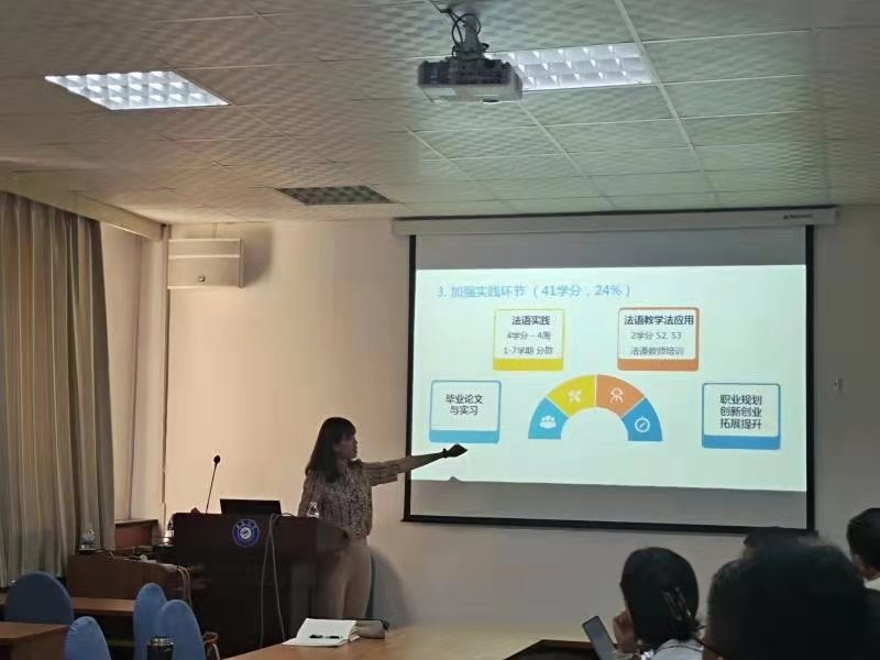 英语系邢富坤主任、英语教育系黄芳主任和王进福副主任、 德语系綦甲福主任、日语系杜雪丽副主任、韩语系杨昊副主任、法语系段丽君主任和马一凡副主任、西班牙系陈皓主任分别介绍了各自专业人才培养方案修订工作的进展情况及目前方案内容、课程体系、学分分配、方案调研和论证的情况,以及需要解决的问题和下一步如何改进完善并按照要求顺利完成方案。