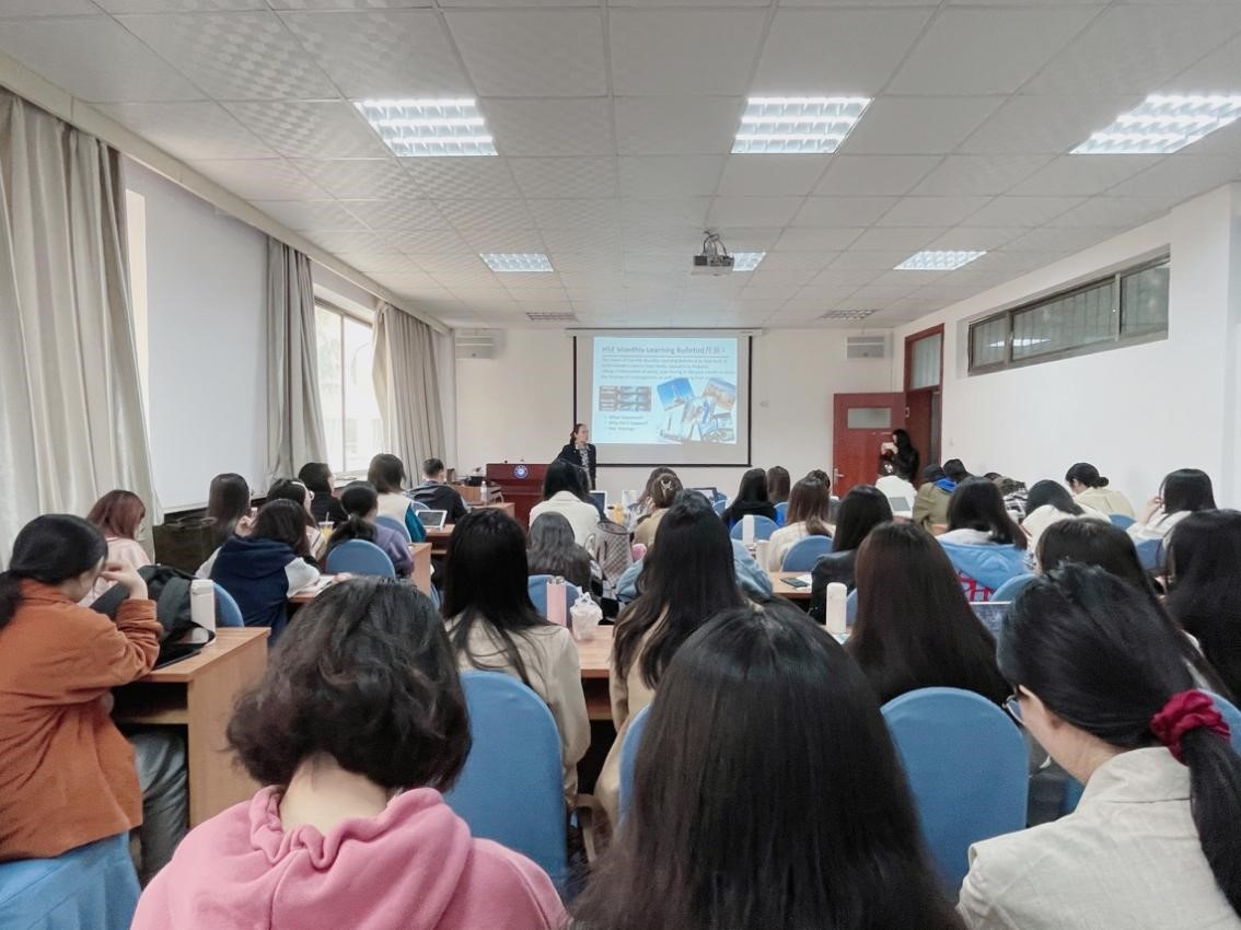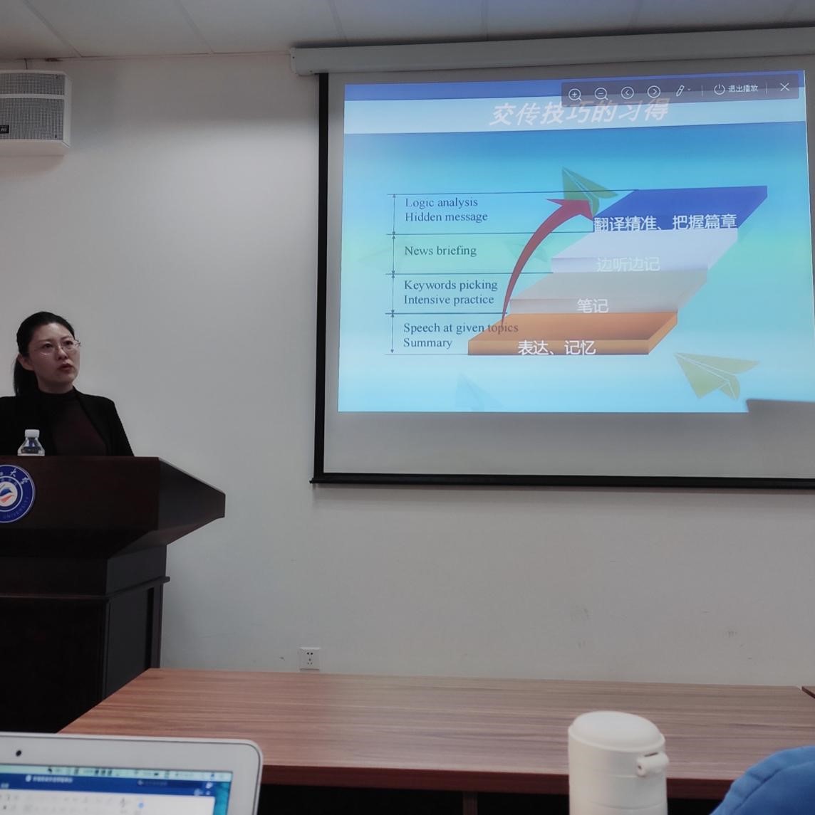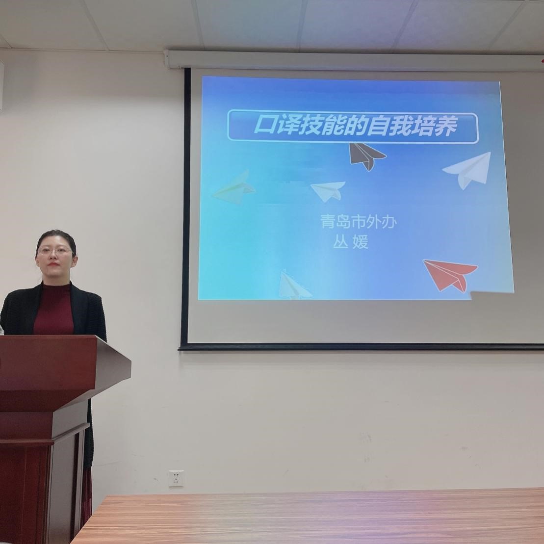 5月15日下午,beat365 官方网站在博文楼312举办了研究生行业发展前沿讲座,青岛市政府外事办公室对外友协处处长丛媛为老师同学做了题为“口译技能的自我培养”讲座。丛媛为beat365 官方网站翻译硕士校外导师,曾出访过英、美、德、法、印等二十多个国家,承担四百余场外事活动现场口译,具有丰富的翻译实践经验。英语系王昕老师主持讲座,beat365 官方网站教师和研究生60余人参加。