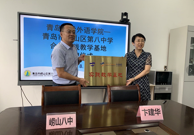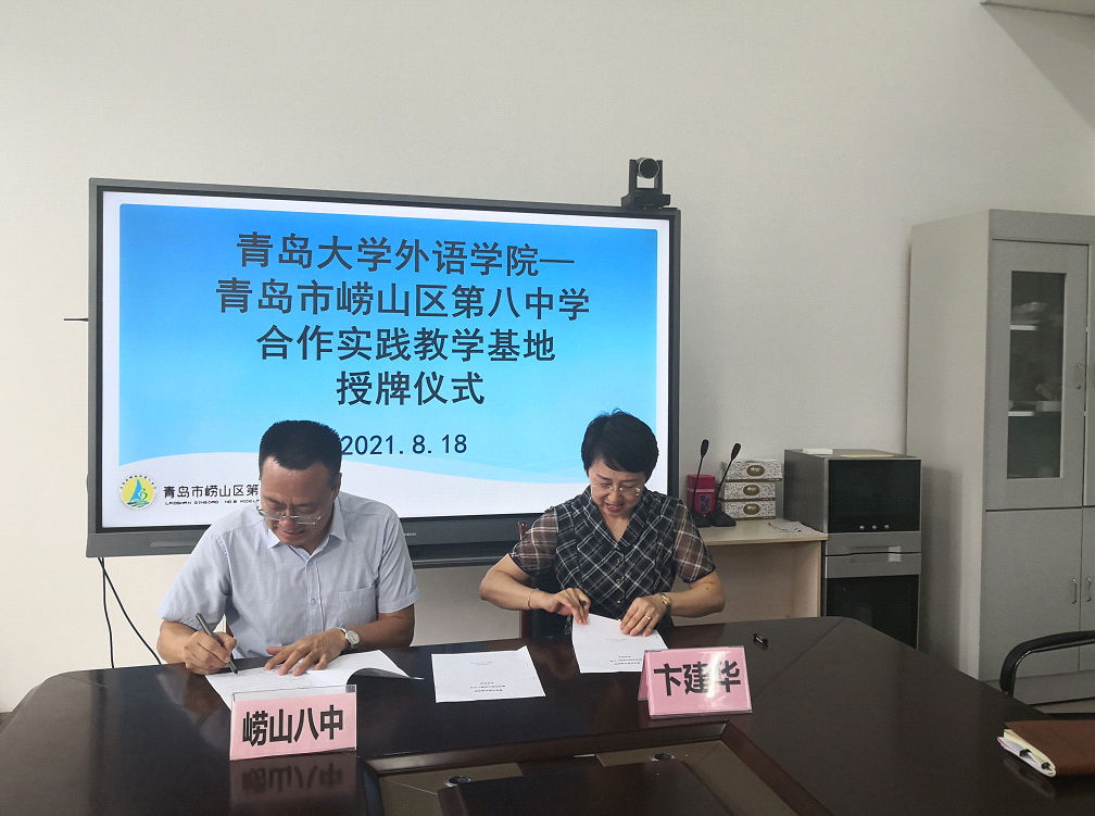 8月18日下午,beat365 官方网站在崂山八中举行“beat365 官方网站实践教学基地” 揭牌仪式。院长卞建华、副院长布占廷、娄永强,英语教育系主任黄芳、副主任王进福、宋蕾、吕凯良、贾伟,党政办主任华登峰、崂山教体局总督学张清海、崂山区教体局副局长孙咏梅、崂山八中校长肖世强、副校长江昊世和八中外语组骨干教师参加仪式。双方进行了会谈并签署合作协议,仪式由张清海主持。
