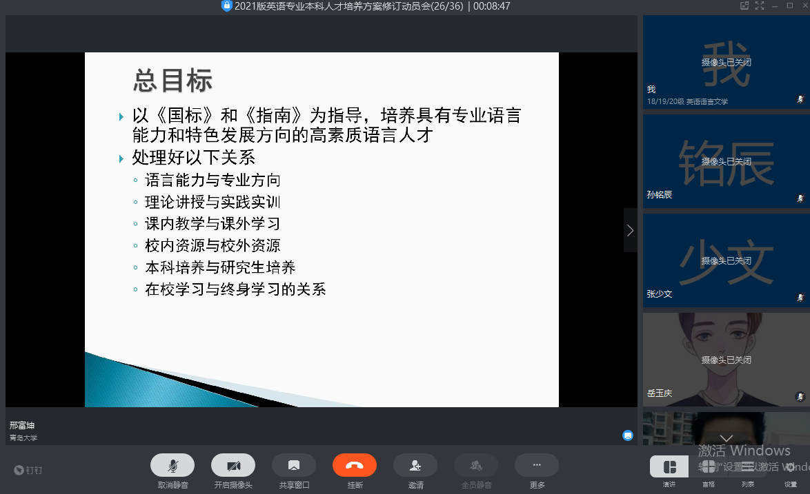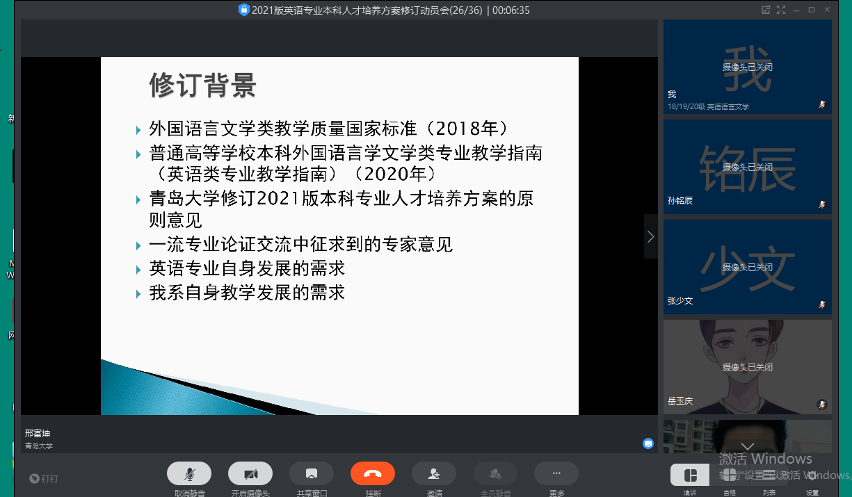 为做好英语专业本科专业人才培养方案的修订工作,落实教育部《英语类专业教学指南》与《beat365 官方网站修订2021版本科专业人才培养方案的原则意见》,3月19日晚,英语系在线召开本科人才培养方案修订动员会,beat365 官方网站院长卞建华参加,英语系全体教师出席会议,会议由英语系主任邢富坤主持。