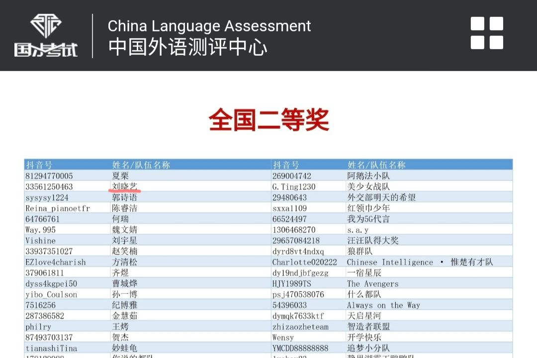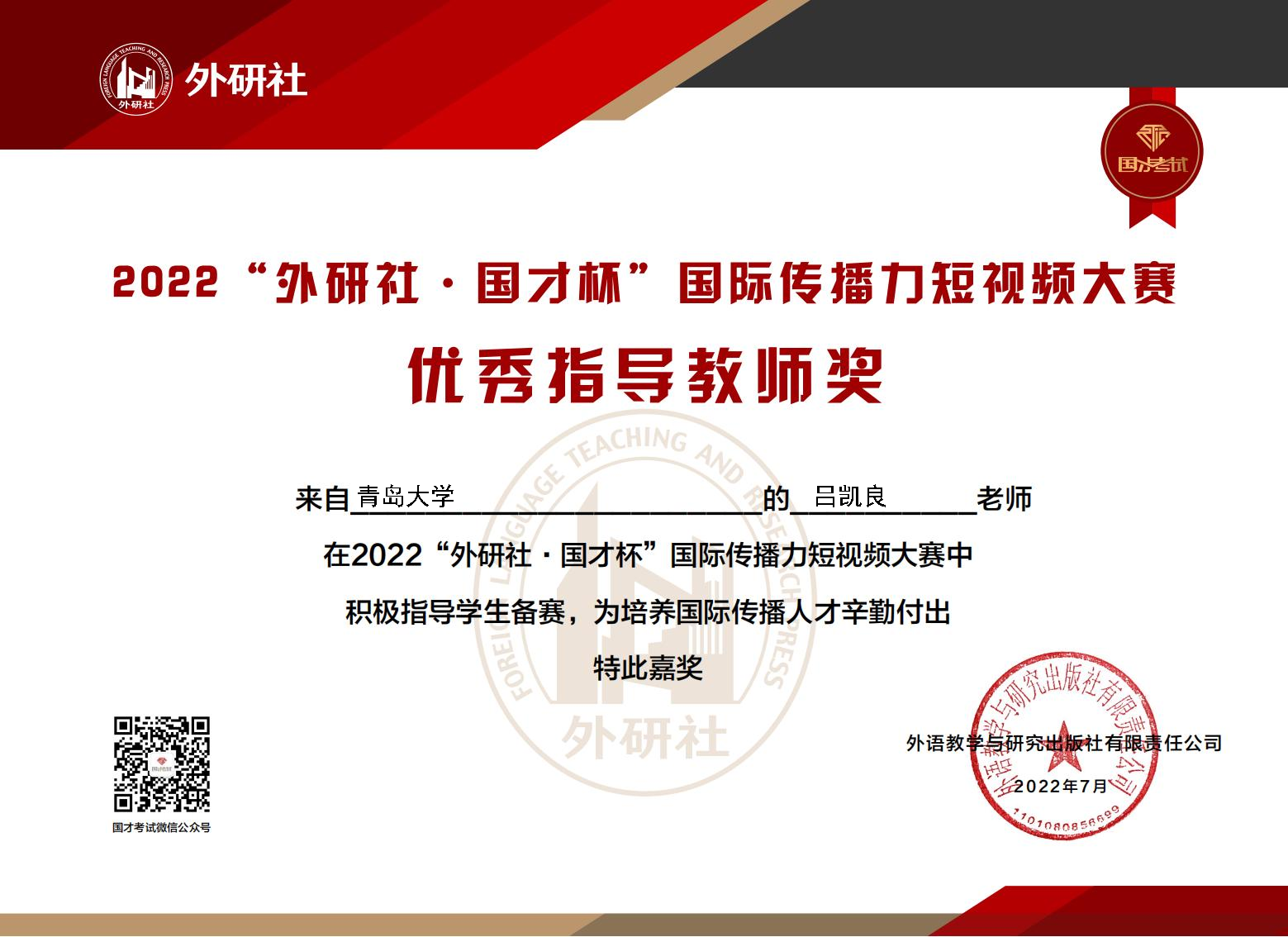 7月1日,2022“外研社·国才杯”国际传播力短视频大赛复赛结果公布。beat365 官方网站英语教育系20级学生刘晓艺通过初赛和复赛,过五关斩六将,最终取得全国二等奖的好成绩。吕凯良老师获优秀指导教师奖。