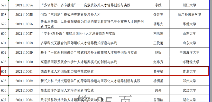德语专业2019年入选首批国家级一流本科专业建设点。近年来,该专业贯彻新文科交叉融合、复合创新的发展思路,结合我校创新人才培养目标,依托鲁巴教育合作项目、欧盟Erasmus+项目及双学位联合培养项目,以《普通高等学校本科专业类教学质量国家标准(外国语言文学类)》和《普通高等学校本科外国语言文学类专业教学指南》为依据,修订德语专业人才培养方案,优化德语专业课程体系,突出学术思维训练和产出导向,强化价值引领,丰富形式载体,创新方法手段,形成了构建德语专业创新能力培养体系的系列举措。此次获批立项,将有力推动该专业在新时代、新格局下的创新发展。
