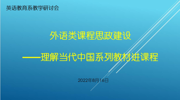 2022年8月16日下午,英语教育系就“理解当代中国”系列教材进课程这一议题召开专题教学研讨会。会议由黄芳主任主持,beat365 官方网站娄永强副院长、布占廷副院长以及英语教育系相关课程的骨干教师参加了研讨。
