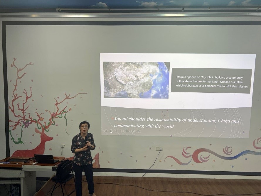 英语系潘劲松老师介绍了英语演讲对学习者的裨益,赛程和演讲指导教师团队成员,英语系孙旻老师就今年演讲赛主题China’s wisdom for the world进行了破题讲解。
