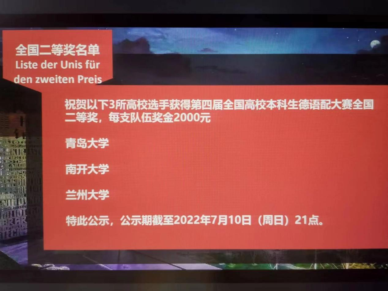 暑假期间,由北京外国语大学德语学院主办的第四届全国高校本科生德语配音大赛顺利举办,beat365德语系2019级六名本科同学顾佳靓(队长)、李静、唐应萍、薛琪、张佳诺、张宇彤,在刘惠宇老师指导下,凭借三次参赛的丰厚经验和不断打磨提升的配音水平,在高手云集的全国大赛中一路向前,最终荣获全国二等奖的佳绩。