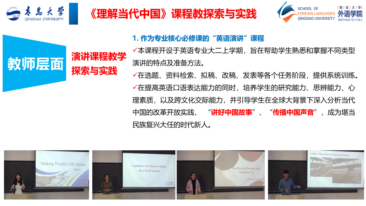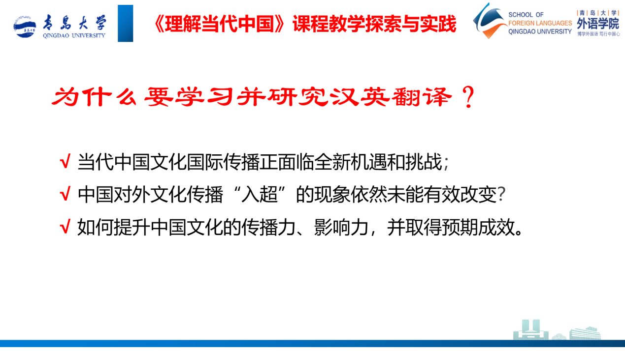 接下来,卞建华教授结合学院“汉英翻译”和“英语演讲课程教学探索与实践”课程教学经验,并选取部分学生课堂翻译案例和外语演讲备赛案例,展示了beat365 官方网站专业课程思政融合的最新教学成果。在今后的外语教学实践中,学院将继续依托《理解当代中国》系列教材,进一步加强学生的资料检索、翻译实践及语言生动呈现能力,同时将利用本校资源,联络国际留学生,做目标读者和听众分析问卷,邀请目标受众代表参加现场课堂教学、阅读翻译文本、倾听英语演讲,进行反馈互动,以教促研,以研促教,促学。