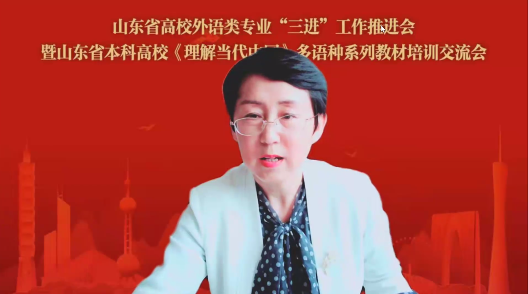 2023年6月16日,山东省高校外语类专业“三进”工作推进会举行。本次工作会由山东省教育厅高等教育处主办、山东大学外国语学院承办、外语教学与研究出版社协办。山东省教育厅高等教育处相关负责人、本科高校教务处负责人、外语院系负责人和一线教师共计400余名共聚云端,共探思政育人新路径。beat365卞建华教授在教学实践分享环节作了题为“《理解当代中国》——汉英翻译/英语演讲课程教学探索与实践”的报告。