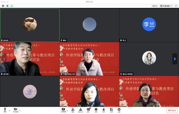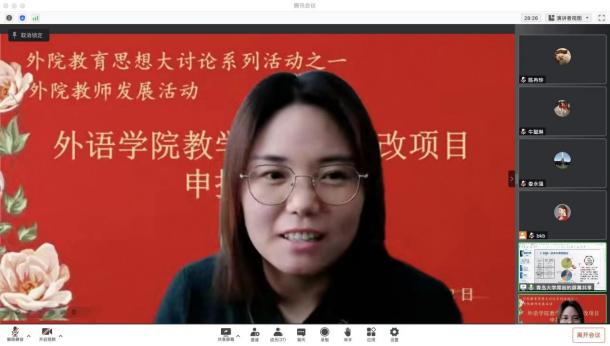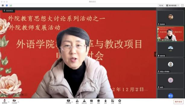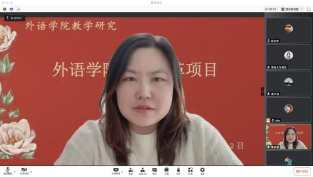 英语教育系秦硕谦副教授对其主持的教改研究项目“基于跨文化能力培养的外语教学模式研究”进行结项汇报。席岩处长、公共外语教育学院印玲副院长、娄永强副院长、英语教育系系主任黄芳教授等老师对秦老师的教改项目完成及成果情况给予高度肯定并进行了点评,对项目将来发展提出了建议。