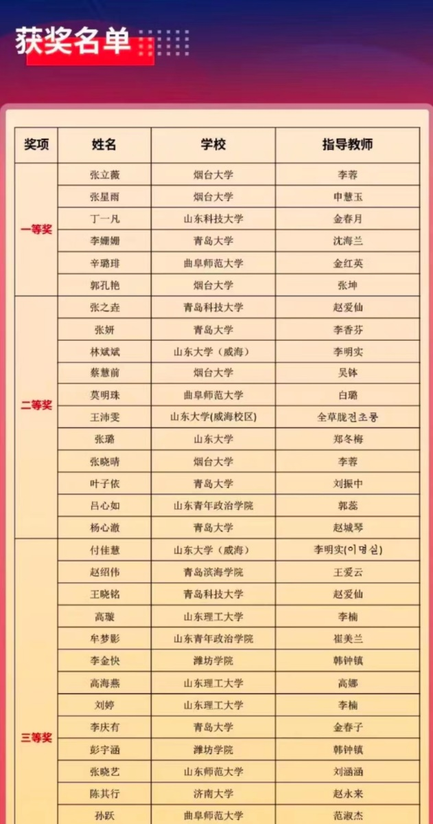 庆祝中韩30周年山东省韩语演讲大赛是中韩建交30周年之际,为加强我省与韩国青年的交流,搭建青年互学互鉴的平台,由山东省人民政府外事办公室、大韩民国驻青岛总领事馆、庆尚南道对外合作担当官室主办,山东省翻译协会承办的比赛。本次大赛得到了韩国学中央研究院与韩国旅游发展局的大力支持,全国各高校朝鲜语专业学生踊跃报名并积极参与。全国共计有49所高校的444名学生报名参加了初赛,共选拔出93名学生进入复赛,最终15名选手脱颖而出,参加了此次全国总决赛。参赛队伍可谓名校云集,高手如云。