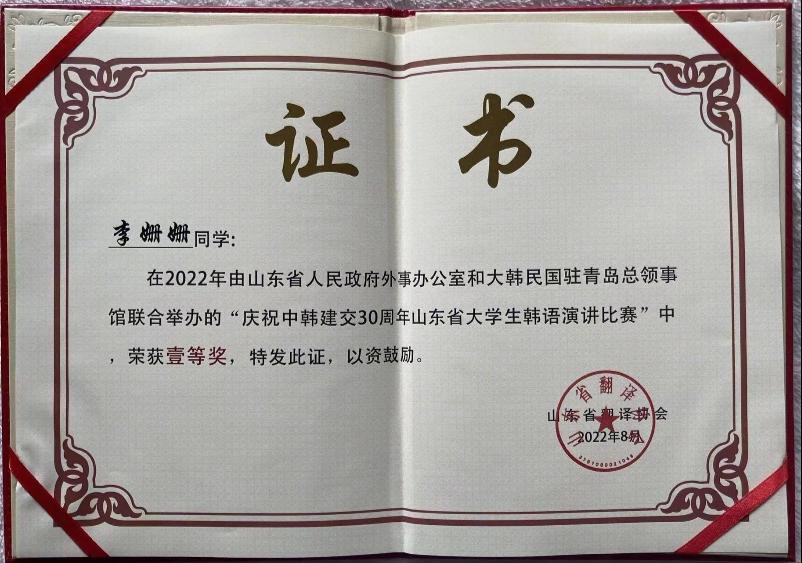 近日,庆祝中韩30周年山东省韩语演讲大赛(初赛)结果揭晓,我系学生在比赛中喜获佳绩,共有6位同学获奖。在山东省韩语演讲大赛总决赛中,我系李珊珊荣获二等奖。