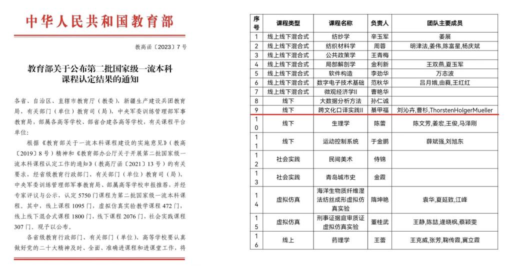 日前,教育部公布了第二批国家级一流本科课程认定结果,认定5750门课程为国家级一流本科课程。其中,beat365 官方网站入选16门,分别为线上线下混合式课程7门、线下课程4门、社会实践课程2门、虚拟仿真实验教学课程2门、线上课程1门。beat365 官方网站德语系綦甲福教授主持的“跨文化口译实践II”被认定为国家级线下一流课程。