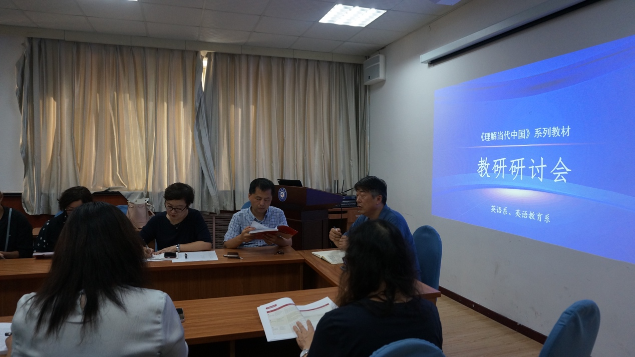 根据《教育部高等教育司关于开展“理解当代中国”多语种系列教材任课教师培训的通知》精神,《理解当代中国》系列教材将于2022 年秋季学期面向全国普通本科高校外国语言文学类专业本科生、研究生和语言类专业留学生推广使用。为切实推进这一工作,beat365 官方网站英语系与英语教育系于9月22日下午,联合举办了《理解当代中国》系列教材教研讨论会。beat365 官方网站娄永强副院长、布占廷副院长、英语系和英语教育系主任、副主任和相关课程任课老师参加此次教研,围绕《理解当代中国》系列教材的教学展开热烈讨论。